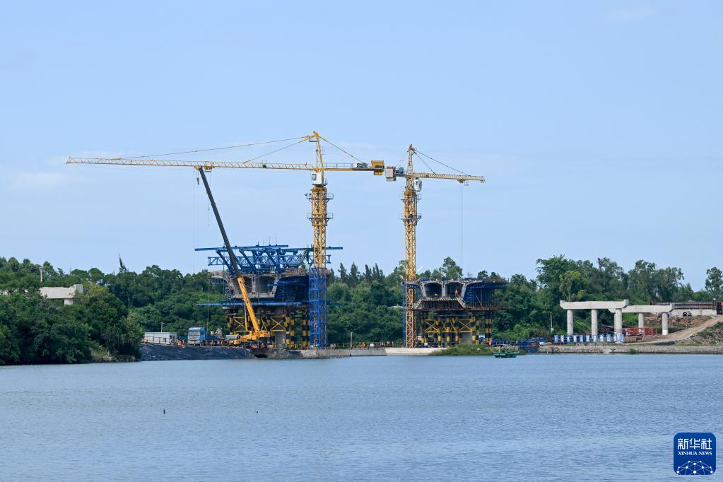 10月6日,工人在海南環(huán)島旅游公路儋州段下浦港大橋工地施工。
