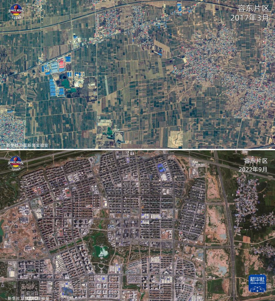 拼版照片:上圖為2017年3月的雄安新區(qū)容東片區(qū)衛(wèi)星圖;下圖為2022年9月的雄安新區(qū)容東片區(qū)衛(wèi)星圖。