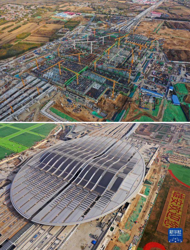 拼版照片:上圖為建設(shè)中的雄安站(無人機照片,2019年11月7日攝);下圖為建成的雄安站(無人機照片,2021年4月1日攝)。