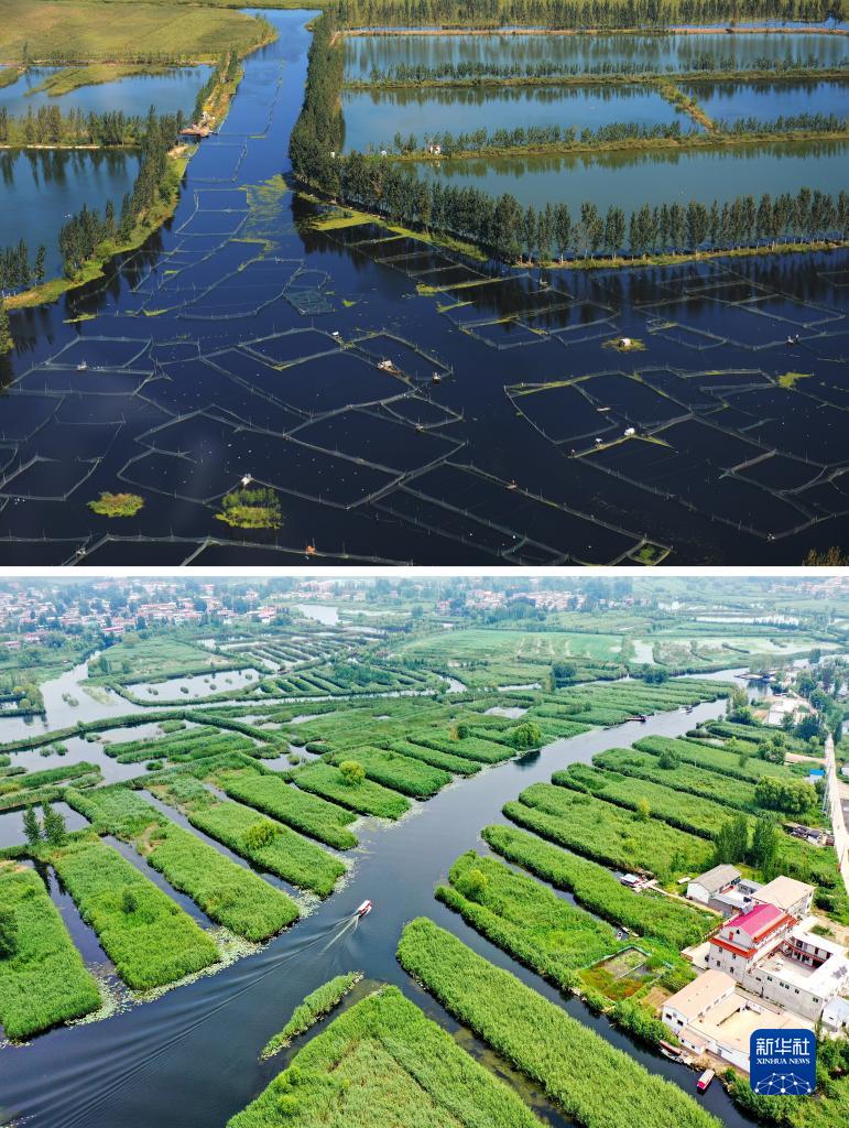 拼版照片:上圖為2012年9月29日拍攝的白洋淀(金潔攝);下圖為2021年8月14日拍攝的白洋淀風光(無人機照片,新華社記者牟宇攝)。
