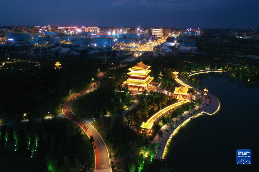 2022年7月28日拍攝的雄安新區(qū)容東片區(qū)金湖公園夜景(無人機照片)。