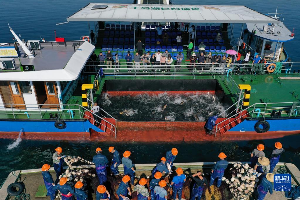 金秋時(shí)節(jié),浙江省淳安縣千島湖黃山尖水域開展巨網(wǎng)捕魚,捕撈隊(duì)員合力拉網(wǎng),捕獲12萬多斤鰱鳙魚,沸騰魚鄉(xiāng)迎來豐收季。