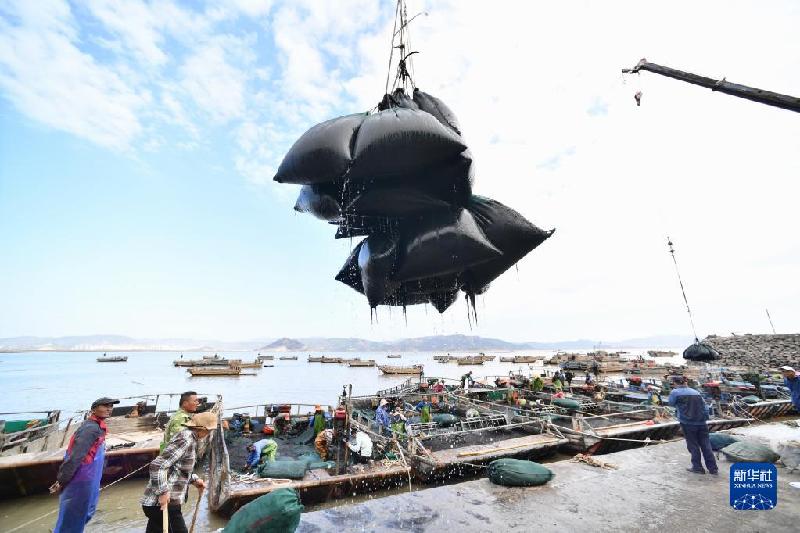 10月21日,工作人員在福建省霞浦縣松山街道沙塘街村碼頭吊運(yùn)新收割的紫菜。