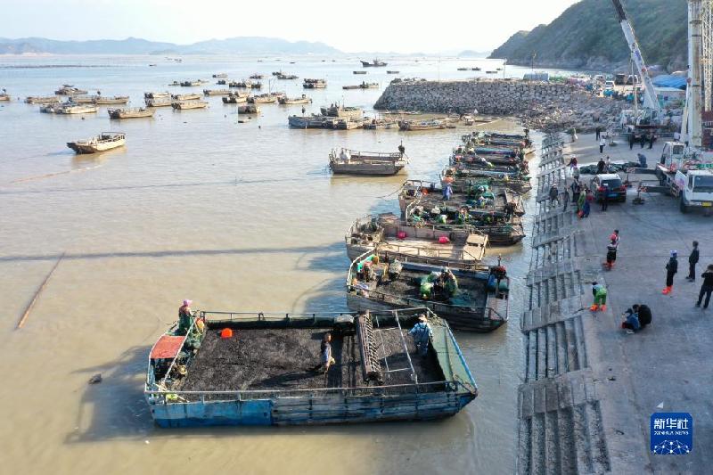 10月21日,漁民在福建省霞浦縣松山街道沙塘街村碼頭裝運(yùn)新收割的頭水紫菜(無人機(jī)照片)。