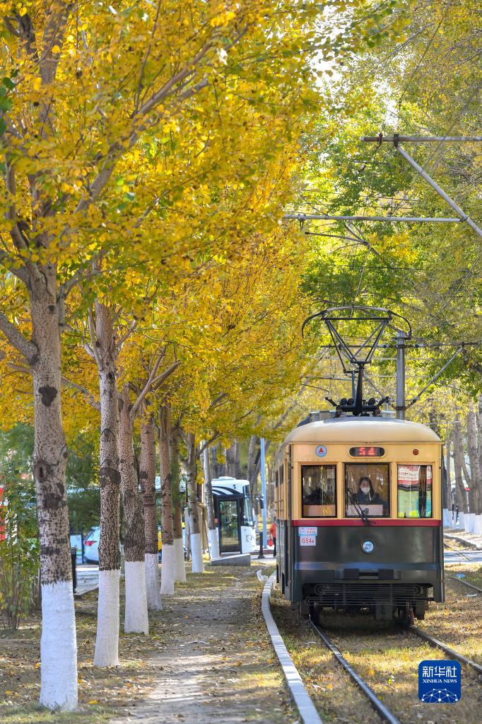 10月19日,在長春市春城大街,一輛電車行駛在軌道上。