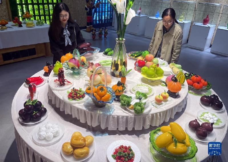 11月12日,游客在山東省淄博一家公司展館觀看琉璃“果蔬”。