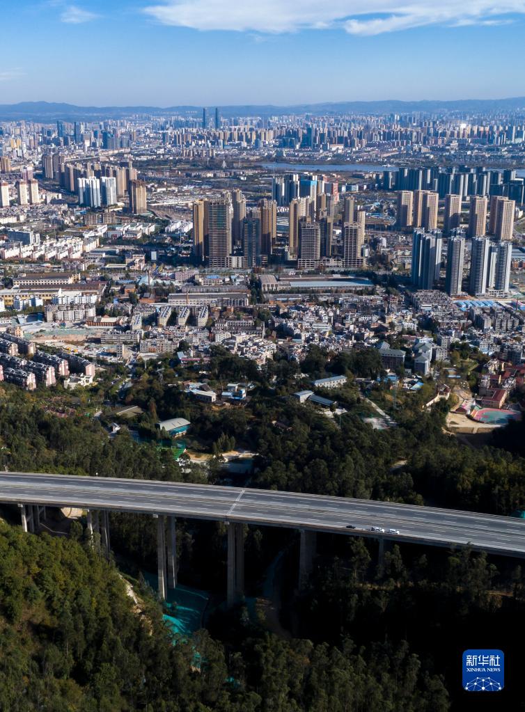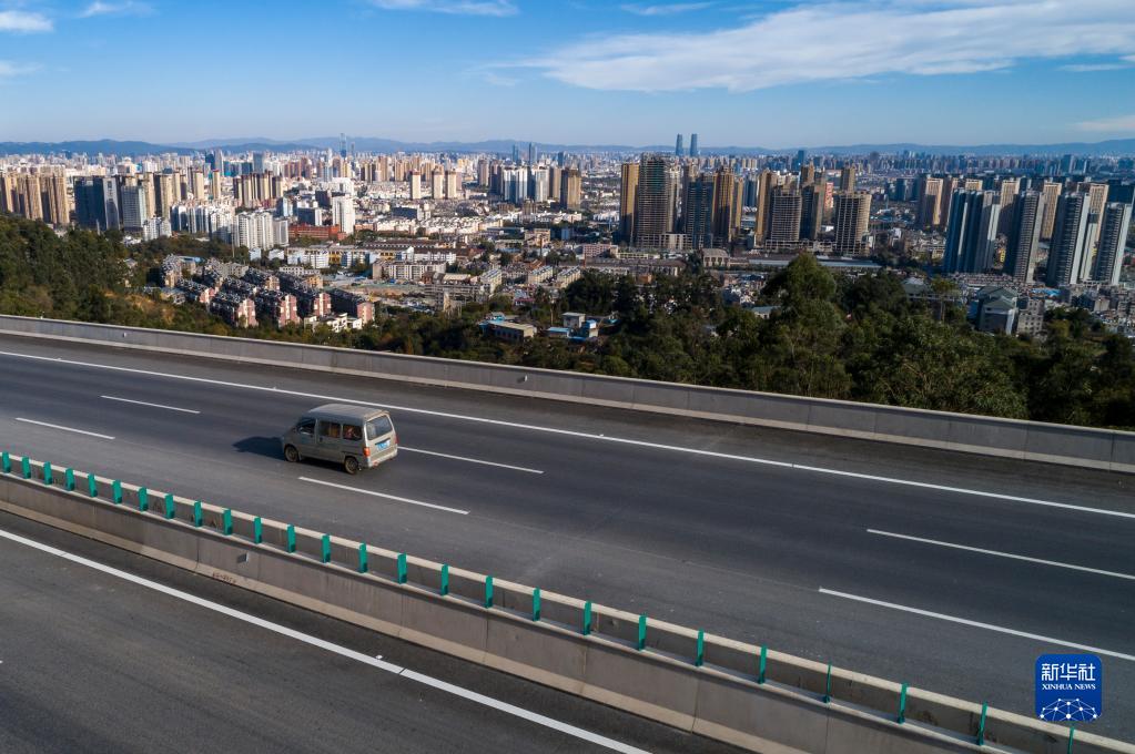 這是12月8日拍攝的新昆楚高速昆明入城段一景,遠處是昆明主城區(qū)(無人機照片)。新華社記者 陳欣波 攝