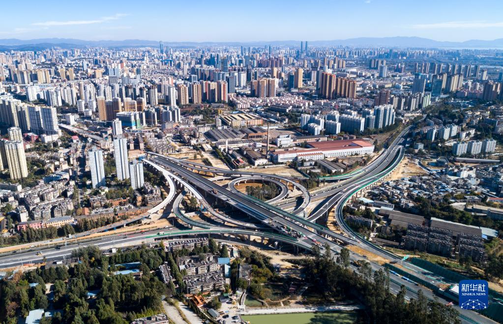 這是12月8日拍攝的新昆楚高速昆明入城段西三環(huán)樞紐立交(無人機照片)。新華社記者 陳欣波 攝