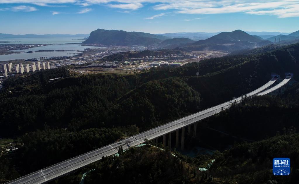 這是12月8日拍攝的新昆楚高速昆明入城段一景,遠處是昆明滇池及西山景區(qū)(無人機照片)。新華社記者 陳欣波 攝