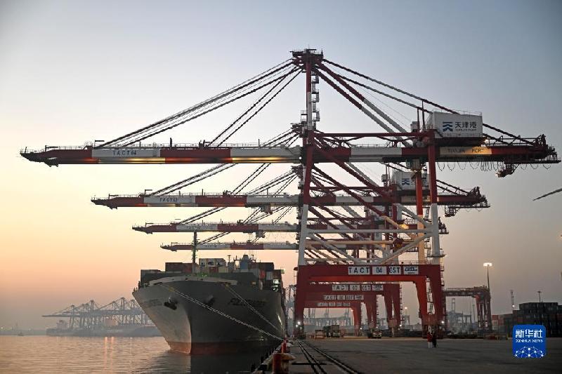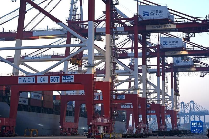 1月1日,一艘貨輪靠泊在天津港聯(lián)盟國(guó)際集裝箱碼頭進(jìn)行裝卸作業(yè)。