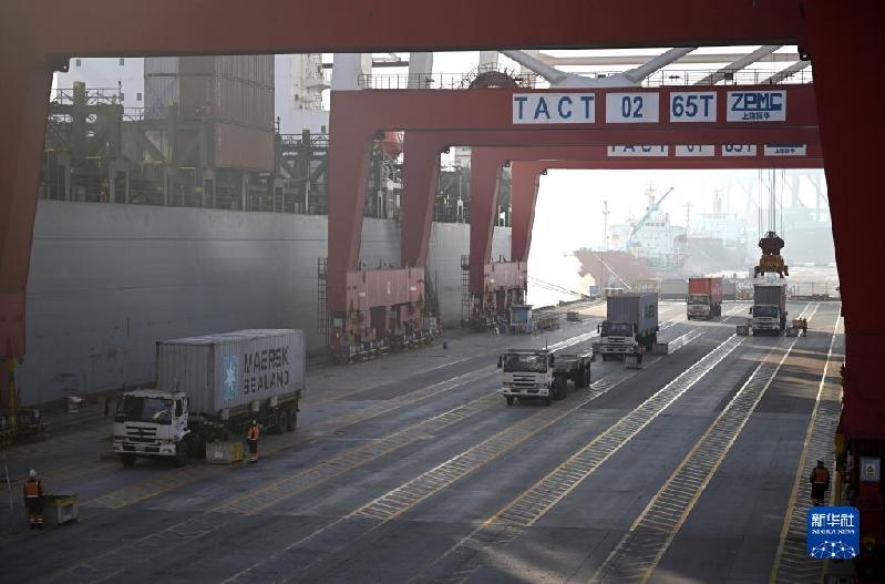 1月1日,卡車在天津港聯(lián)盟國(guó)際集裝箱碼頭運(yùn)輸集裝箱。