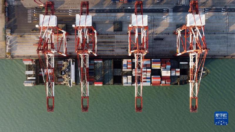 1月1日,貨輪靠泊在天津港太平洋國(guó)際集裝箱碼頭進(jìn)行裝卸作業(yè)(無人機(jī)照片)。