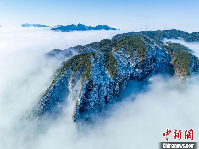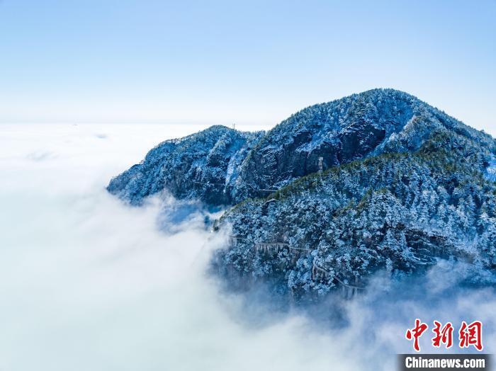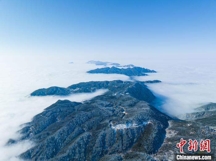 圖為航拍江西明月山雪后初霽銀裝素裹,霧凇掛滿枝頭,茫茫云海在群山之間翻涌,一幅壯美冬日畫卷映入眼簾。江西明月山景區(qū)供圖