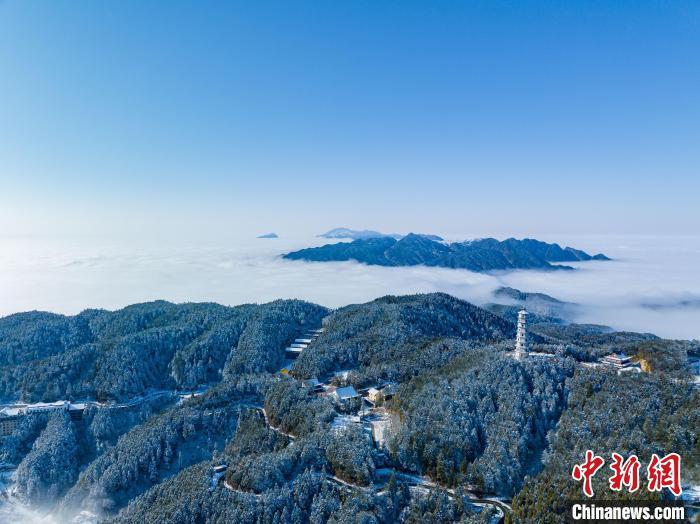 圖為航拍江西明月山雪后初霽,云霧繚繞,壯美如畫。江西明月山景區(qū)供圖