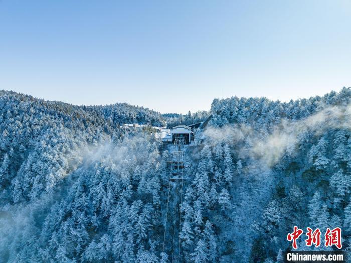 圖為航拍江西明月山雪后初霽,漫山遍野白雪皚皚,霧凇掛滿枝頭,壯美如畫。 江西明月山景區(qū)供圖