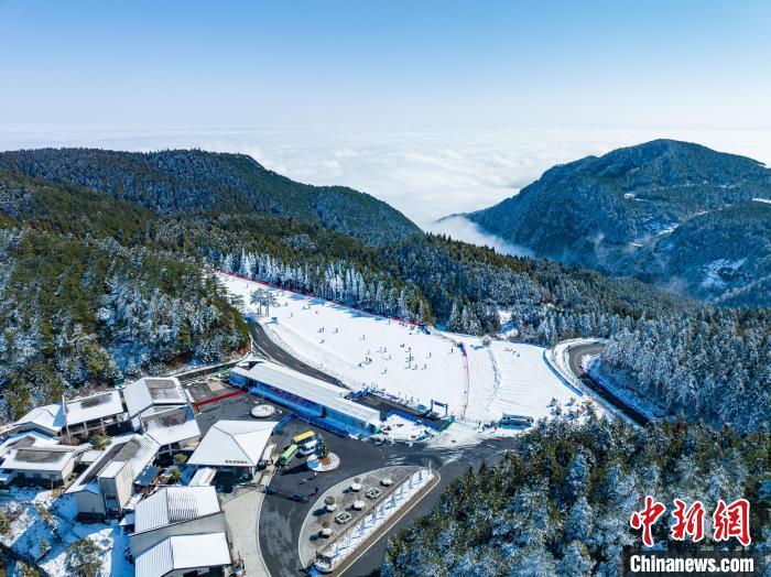 圖為航拍江西明月山雪后初霽,漫山遍野白雪皚皚,霧凇掛滿枝頭,一些游客在山上的滑雪場滑雪。 江西明月山景區(qū)供圖