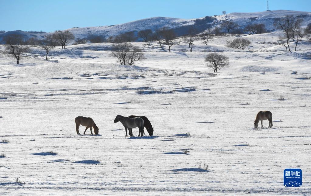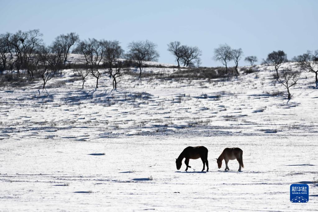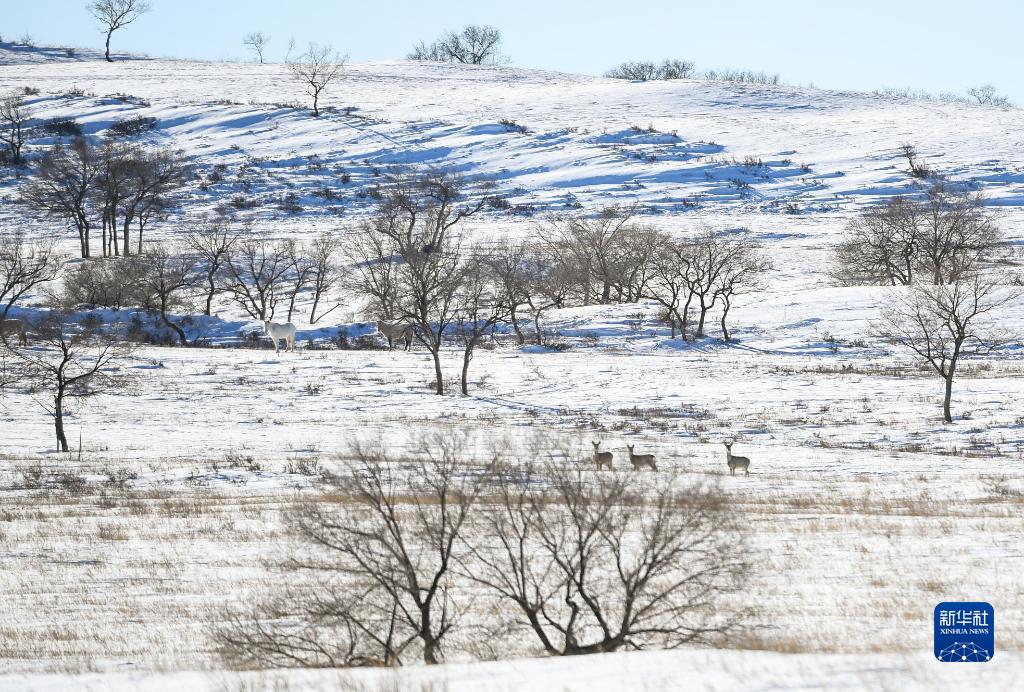寒冬時節(jié),內(nèi)蒙古錫林郭勒盟西烏珠穆沁旗的草原銀裝素裹,樹木點綴其間,動物悠閑覓食,一派美麗的冬日景象。