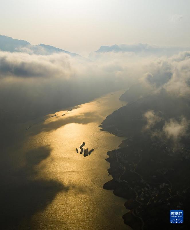 1月18日,船舶行駛在長(zhǎng)江三峽湖北省宜昌市秭歸縣水域(無(wú)人機(jī)照片)。