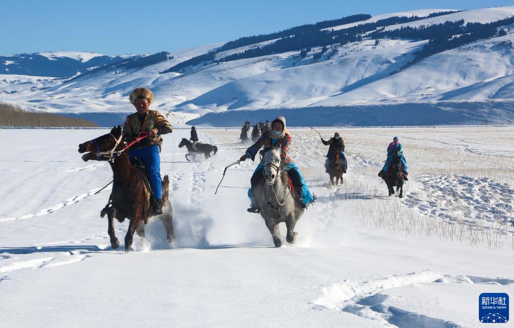 在新疆昭蘇縣薩爾闊布鄉(xiāng)一處雪原上,當?shù)剞r(nóng)牧民進行“姑娘追”活動(2022年12月21日攝)?!肮媚镒贰笔枪_克族的傳統(tǒng)馬上體育運動。入冬以來,昭蘇縣各族農(nóng)牧民開展豐富多彩的民間文化體育活動,豐富冬閑時節(jié)生活。新華社發(fā)(李文武攝)