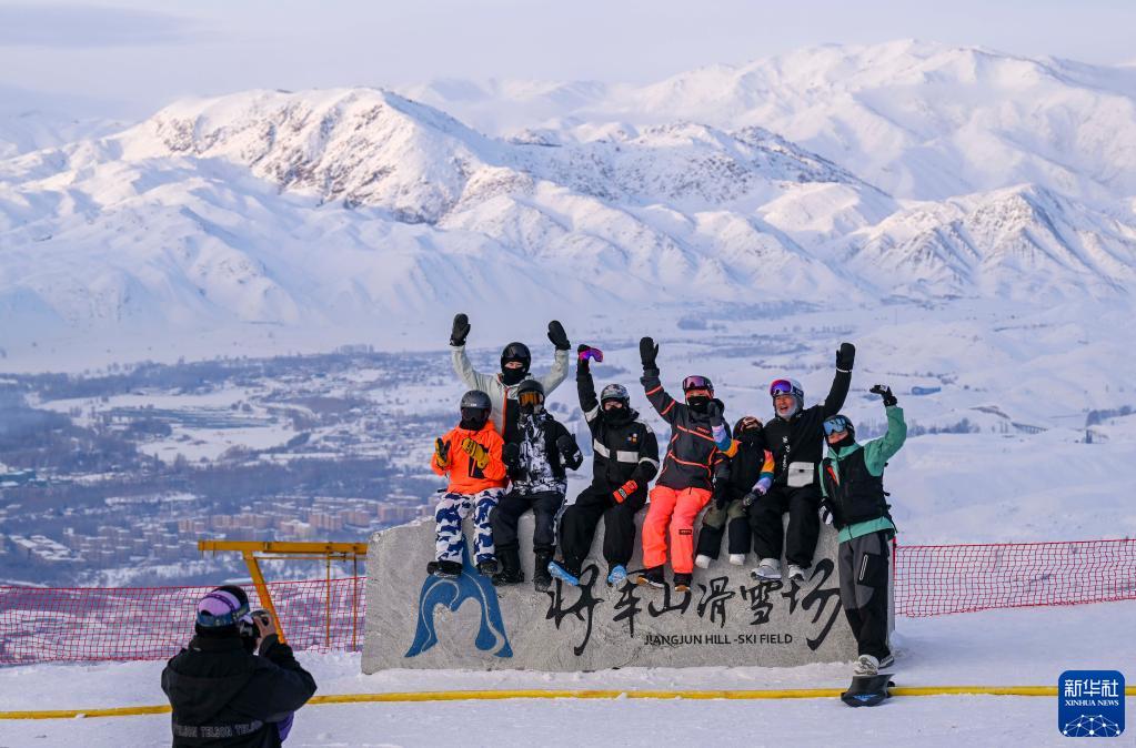 游客在新疆阿勒泰將軍山滑雪場合影留念(2022年12月30日攝)。新華社記者 胡虎虎 攝