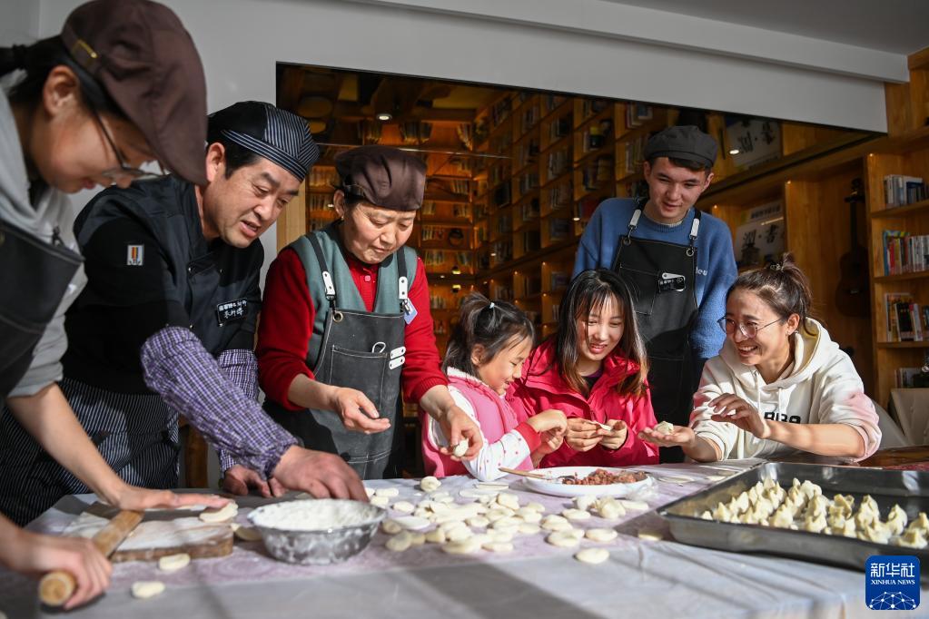 新疆烏魯木齊縣板房溝鄉(xiāng)樂野民宿,來自廣州的游客柳佳佳(右三)一家和民宿工作人員一起包餃子(2023年1月20日攝)。新華社記者丁磊 攝