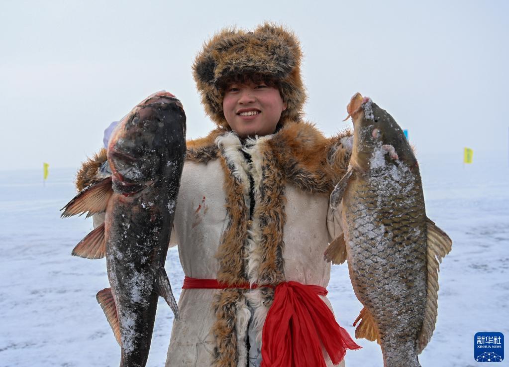在新疆福??h第十六屆烏倫古湖冬捕文化旅游節(jié)上,漁工展示勞動收獲(2023年1月7日攝)。新華社記者 李響 攝
