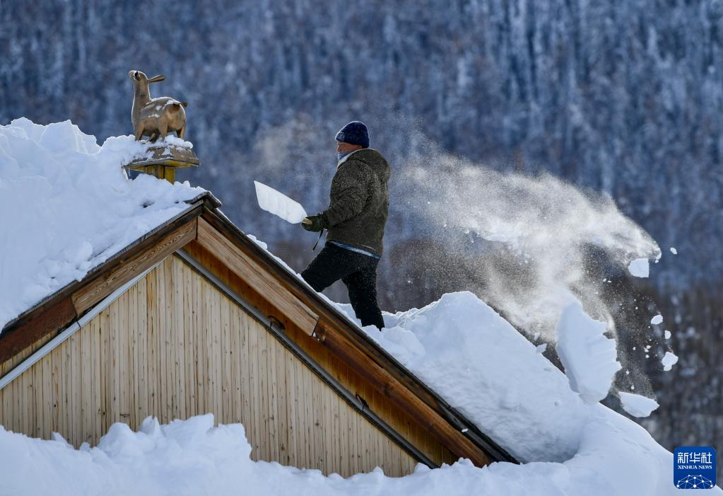 新疆阿勒泰地區(qū)禾木村村民清掃屋頂積雪(2023年1月14日攝)。新華社記者 胡虎虎 攝