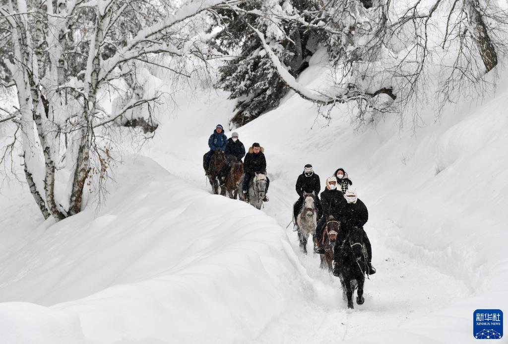 游客在新疆阿勒泰地區(qū)騎馬賞雪(2023年1月7日攝)。新華社記者 胡虎虎 攝