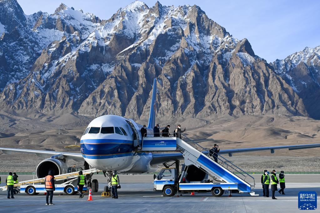 2022年12月23日,巍巍帕米爾高原上,中國最西端的運輸機場——新疆塔什庫爾干紅其拉甫機場正式通航,冰山上迎來首批“空中來客”。新華社記者丁磊 攝