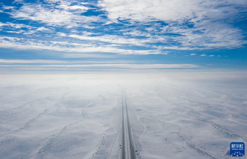 阿勒泰至烏魯木齊的高速公路,穿越古爾班通古特沙漠(2023年1月16日攝,無人機照片)。