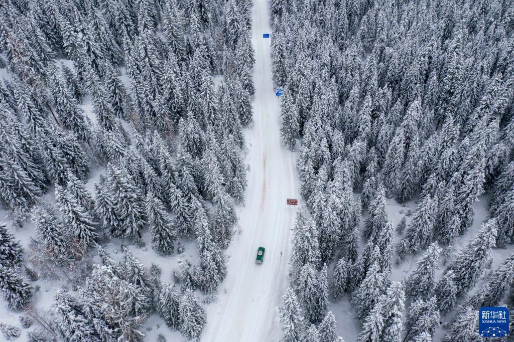 游客駕車在新疆喀納斯景區(qū)行駛(2023年1月8日攝,無人機照片)。新華社記者 胡虎虎 攝