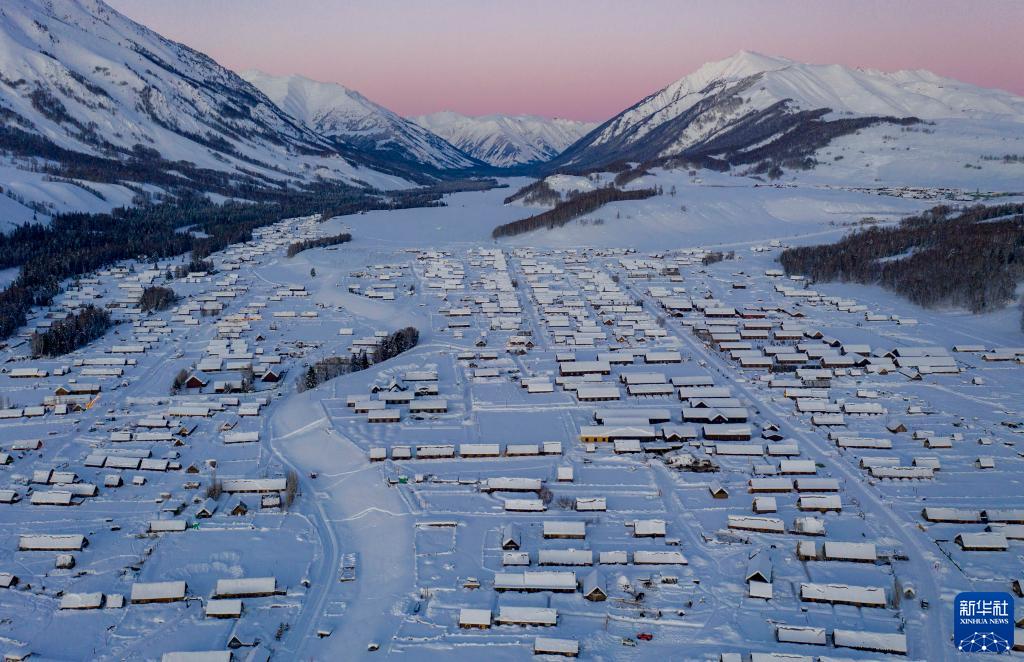 冬日新疆,冰雪點綴。皚皚白雪掩蓋了大地的顏色,整個世界變得純潔靜謐。俯瞰樹林,松濤蕩漾,白霜盡染;遠眺村落,粉妝玉砌,美如仙境。