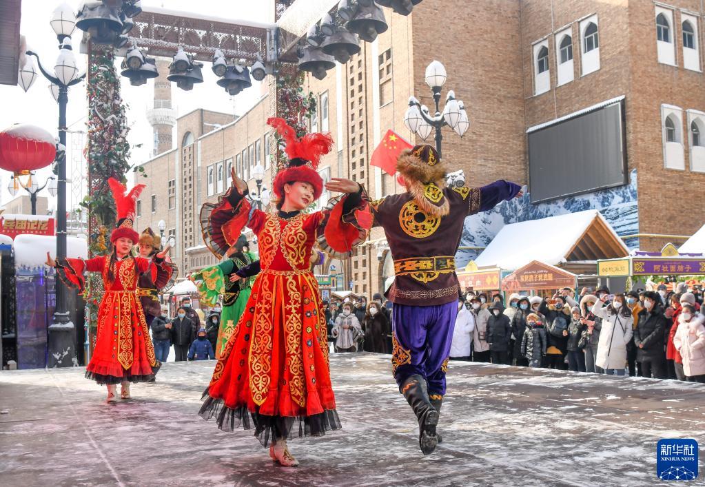 烏魯木齊大巴扎景區(qū),市民和游客觀賞慶新春歌舞表演(2023年1月23日攝)。新華社記者 王菲 攝