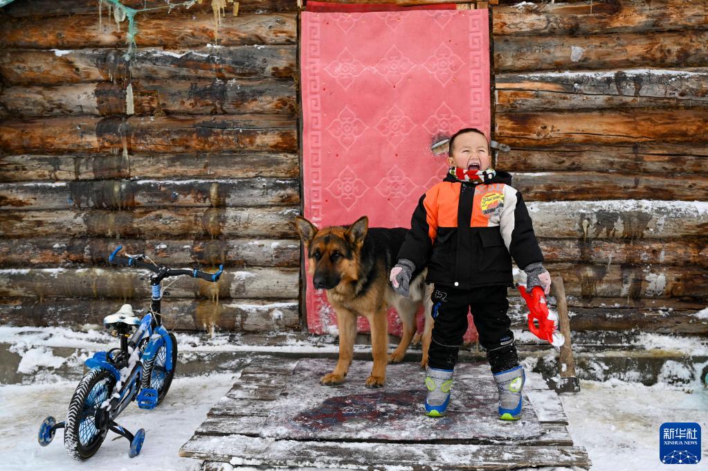 新疆阿勒泰地區(qū)禾木村的小朋友其力格爾在小木屋前玩耍(2023年1月11日攝)。新華社記者 胡虎虎 攝