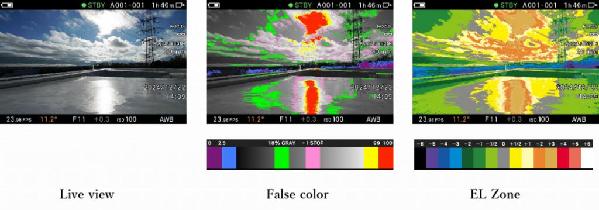 " 偽色 " 菜單新增 "EL ZONE" 選項(xiàng),該功能以屏幕顏色來(lái)指示當(dāng)前場(chǎng)景的曝光指數(shù)顯示,讓您隨時(shí)監(jiān)控屏幕任意部分的曝光狀態(tài)。