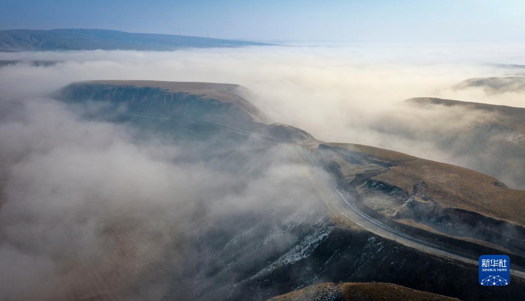 當(dāng)日,寧夏吳忠市同心縣的山谷間出現(xiàn)云海景觀,農(nóng)田、旱塬、公路在霧中若隱若現(xiàn),景色壯美。
