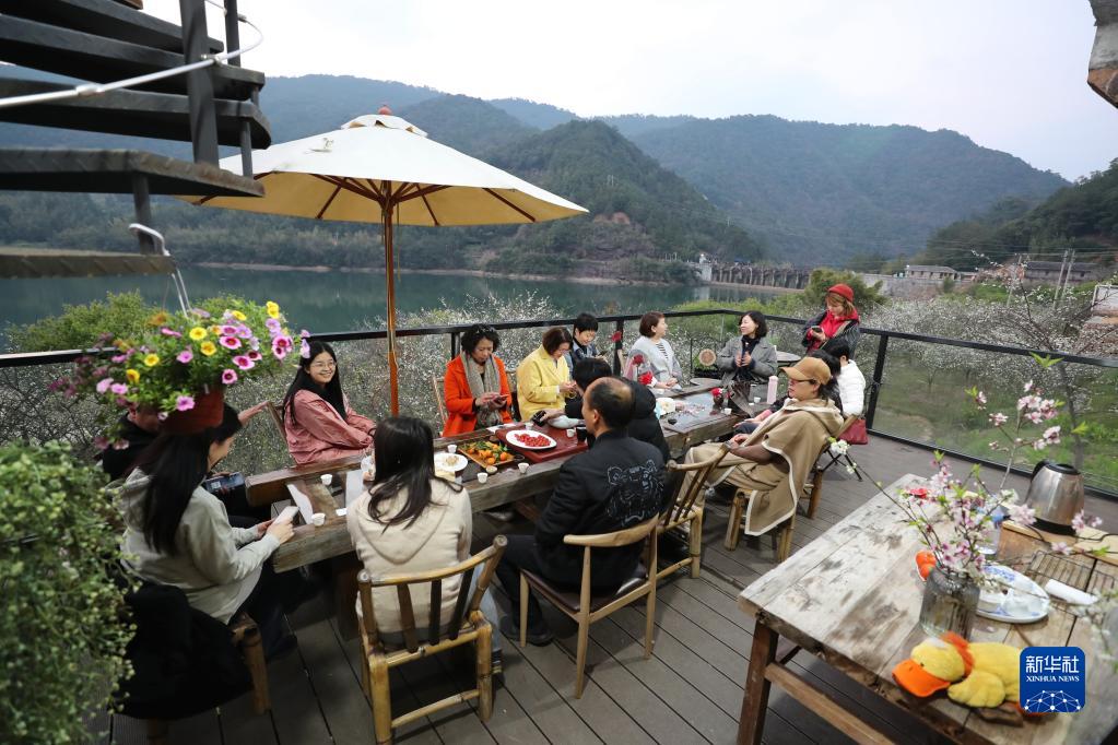 福州市永泰縣嵩口鎮(zhèn)大喜村游客在李花環(huán)繞的觀景臺上聊天(2月24日攝)。