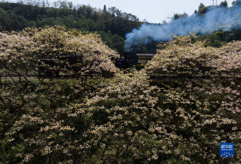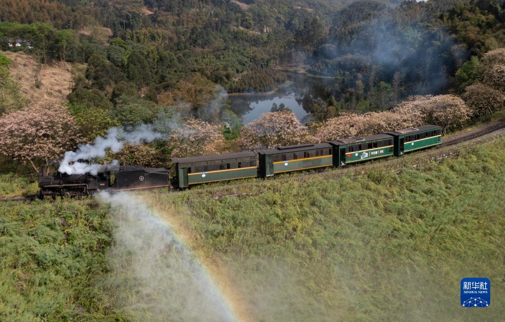 4月9日,一列嘉陽小火車經(jīng)過亮水沱站的桐子花叢,噴出的蒸汽形成一道彩虹(無人機照片)。