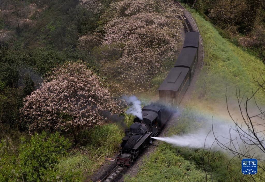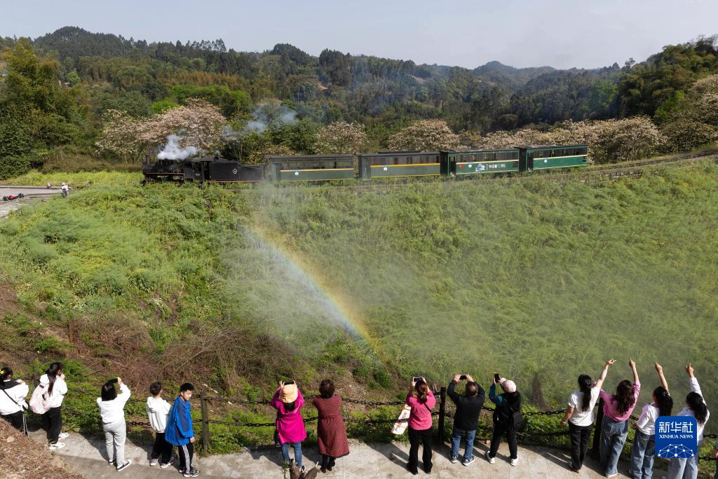 4月9日,一列嘉陽小火車經(jīng)過亮水沱站的桐子花叢,噴出的蒸汽形成一道彩虹。