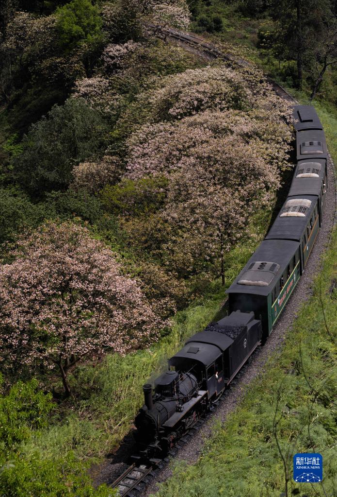 4月9日,一列嘉陽小火車經(jīng)過亮水沱站的桐子花叢。