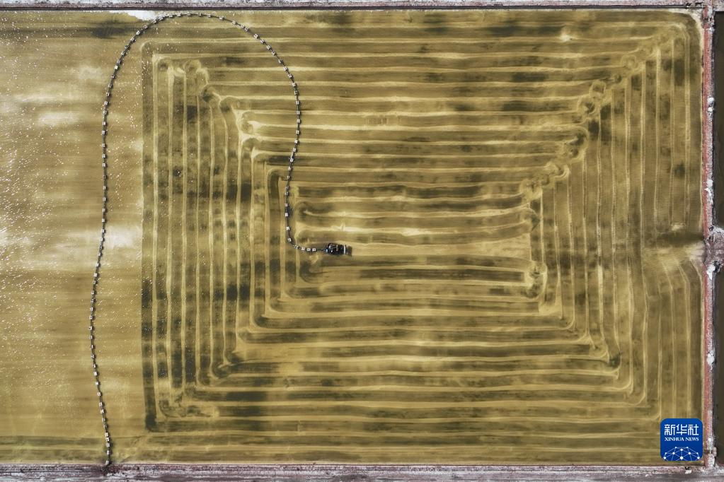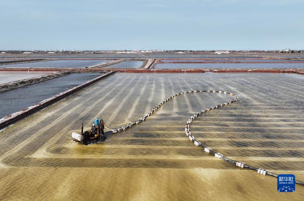 5月14日,唐山市曹妃甸區(qū)南堡鹽場(chǎng)的工人在鹽田內(nèi)使用機(jī)械設(shè)備收獲春鹽(無人機(jī)照片)。