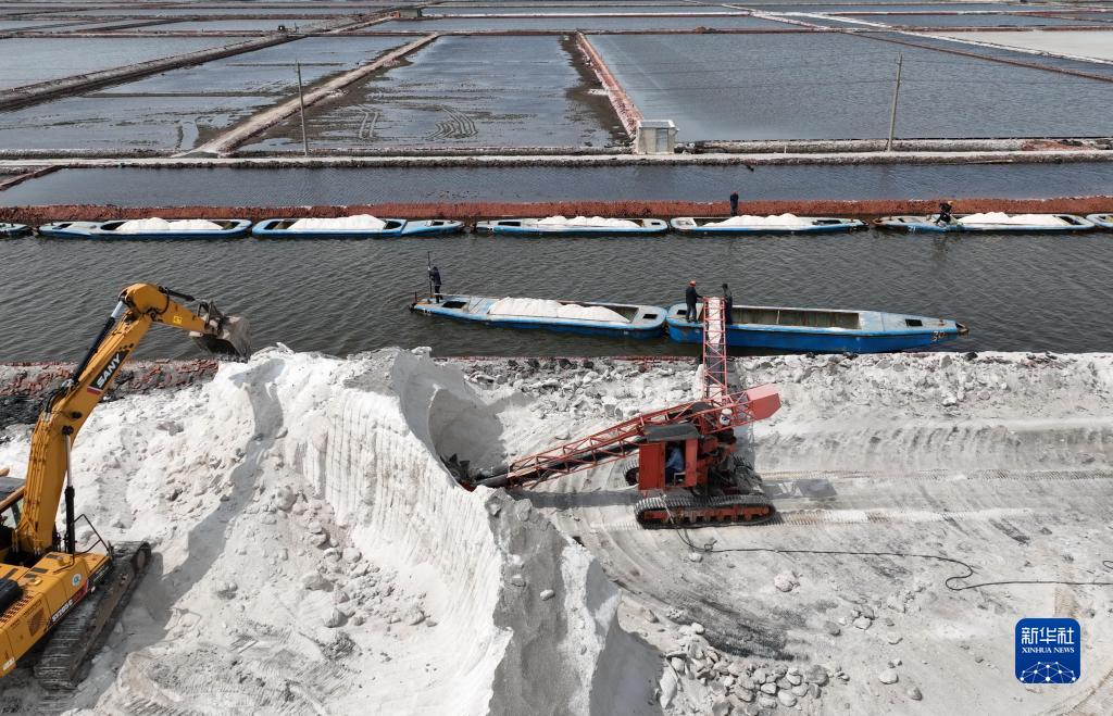 5月14日,唐山市曹妃甸區(qū)南堡鹽場(chǎng)的工人在將收獲的春鹽裝船(無人機(jī)照片)。