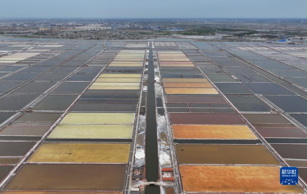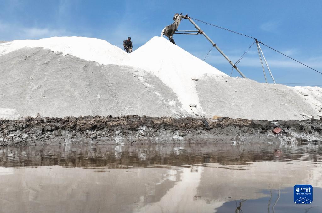 5月14日,唐山市曹妃甸區(qū)南堡鹽場(chǎng)的工人在整理春鹽。