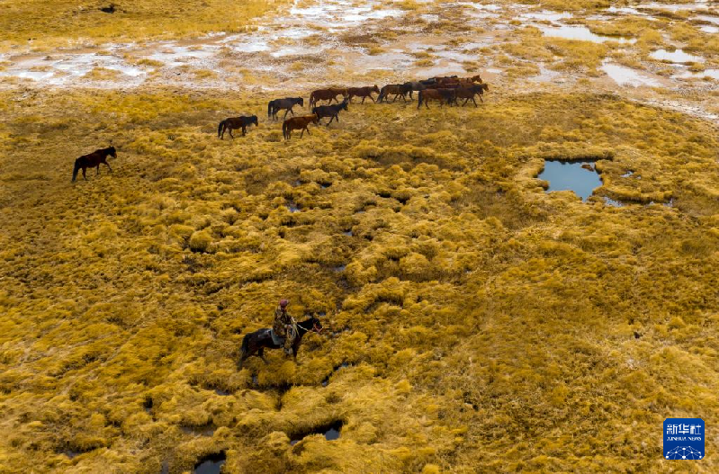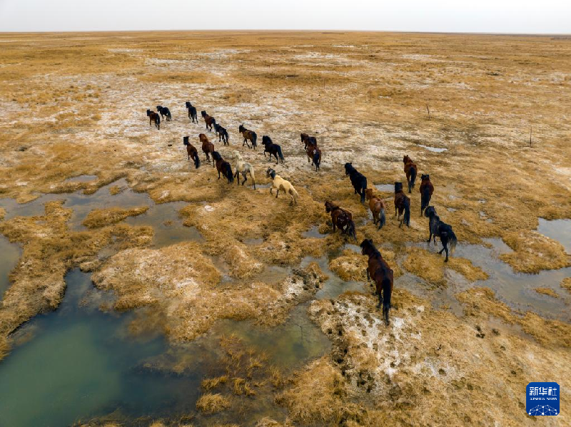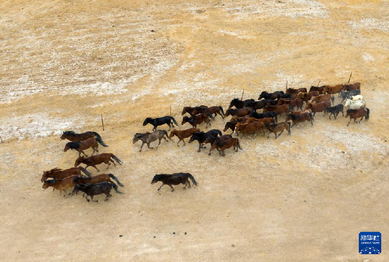 5月3日,在阿克塞縣阿伊納鄉(xiāng)海子草原,馬群轉(zhuǎn)場去往夏季牧場(無人機照片)。