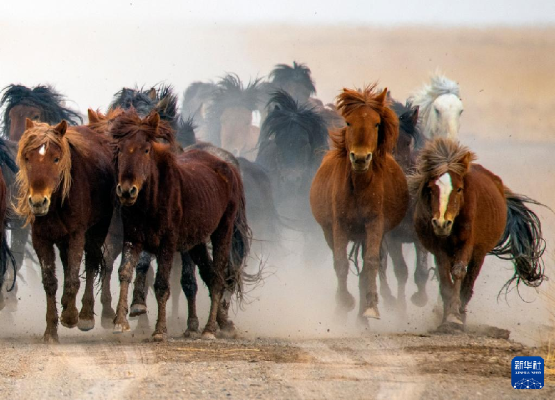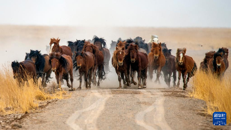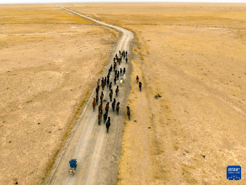 5月3日,在阿克塞縣阿伊納鄉(xiāng)海子草原,馬群轉(zhuǎn)場去往夏季牧場。