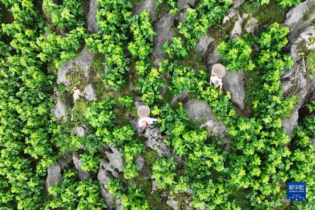 6月2日,重慶市黔江區(qū)濯水鎮(zhèn)雙龍村村民在石漠化蠶?;毓茏o(hù)桑樹(shù)(無(wú)人機(jī)照片)。