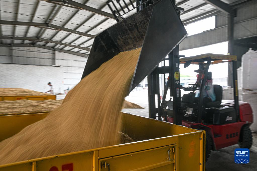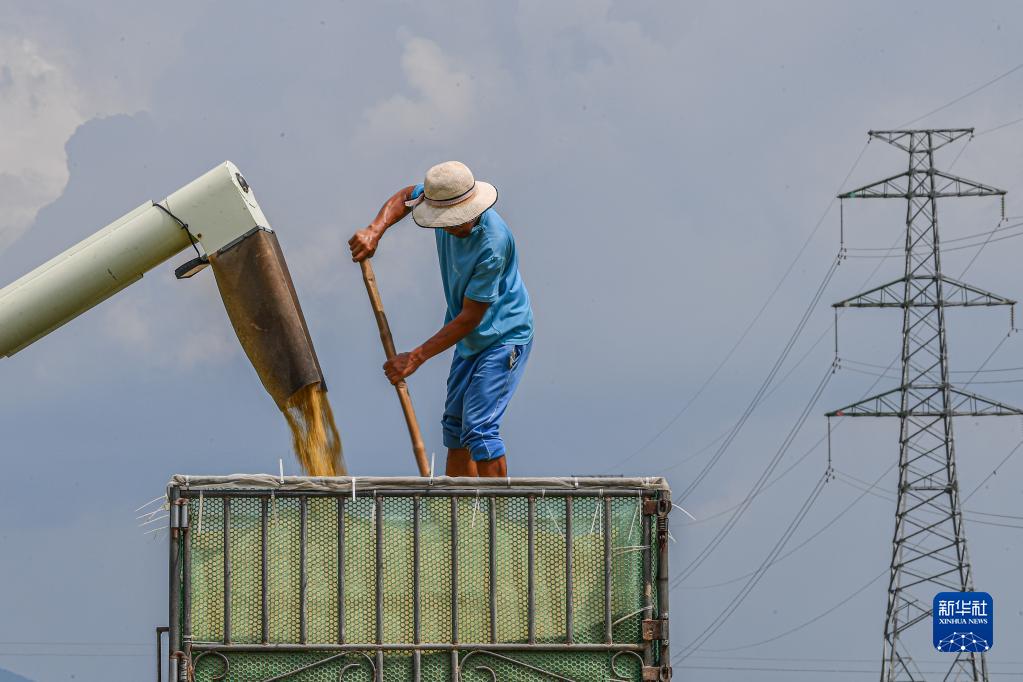 6月4日,在位于海南省東方市的海南農(nóng)樂南繁科技有限公司制種基地,工人整理從收割機(jī)上卸下的稻種。