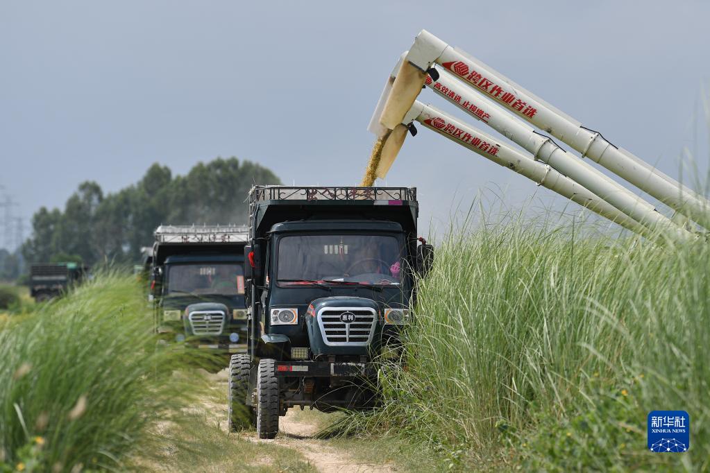6月4日,在位于海南省東方市的海南農(nóng)樂南繁科技有限公司制種基地,農(nóng)用車排隊(duì)等候轉(zhuǎn)運(yùn)收割機(jī)剛收獲的稻種。