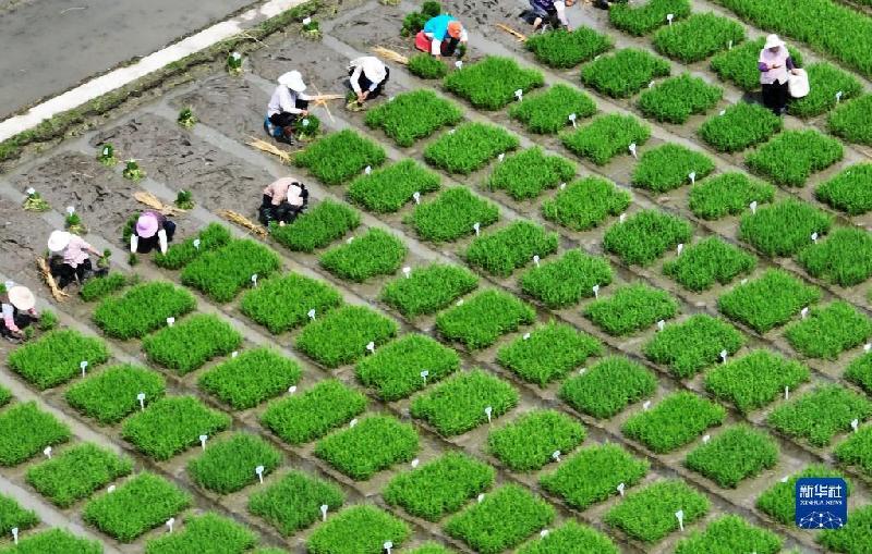 6月11日,在江蘇里下河地區(qū)農(nóng)科所(揚州市農(nóng)科院),農(nóng)民在試驗田里起秧苗(無人機照片)。