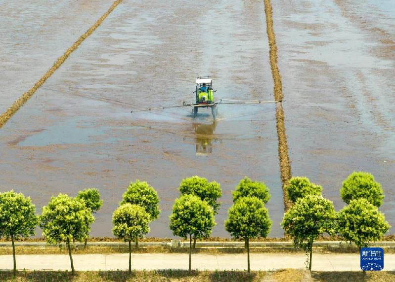 6月11日,在江蘇省興化市周莊鎮(zhèn)胡官村,農(nóng)民駕駛自走式噴霧機在水稻田中勞作(無人機照片)。